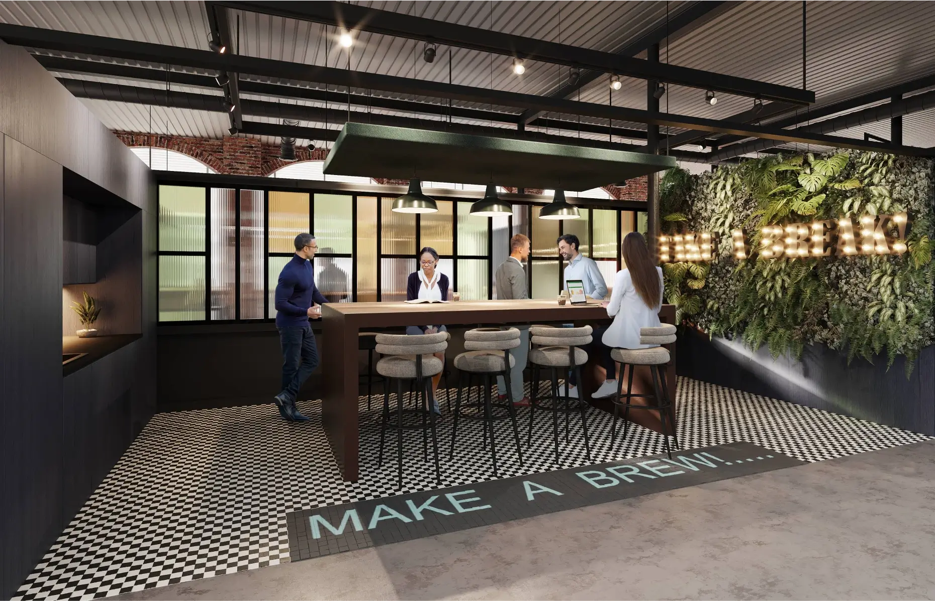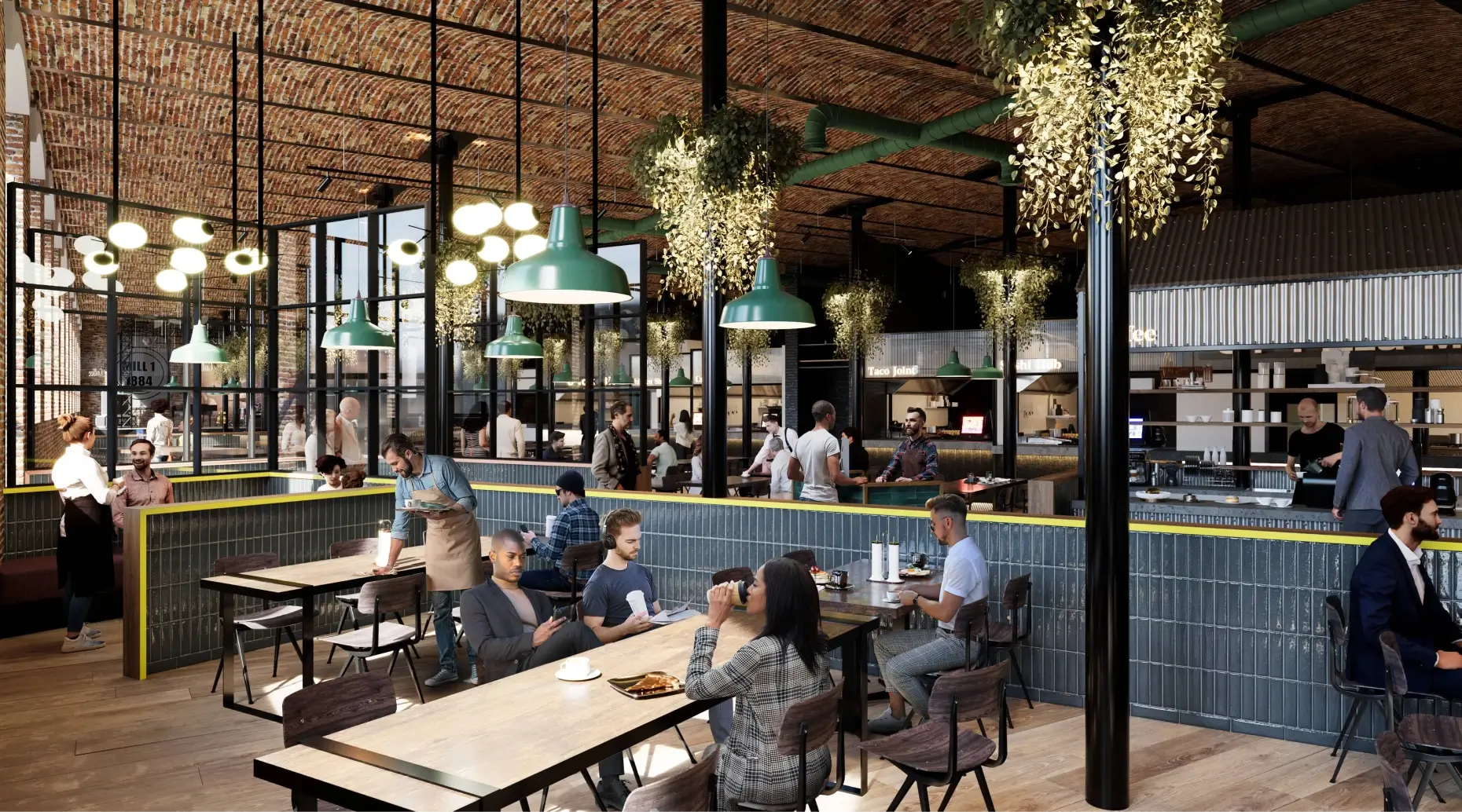 The 22,000 sqft ground floor will be home to a huge new food hall with seven, independent, carefully curated food traders, seating for hundreds of customers, a coffee/ breakfast offering and a cocktail bar. We’ve also created an exciting space to host live entertainment and music. The ground floor will also contain an independent pub called The Three Mills selling locally sourced craft beer and great bar snacks; a great venue for enjoying sports with multiple big screens and space for darts. Ample space outside on a raised terrace for alfresco drinks will make this a versatile venue that will appeal to a large range of customers. The food hall and pub will be surrounded by communal, landscaped spaces for dining, relaxing and entertainment. Think paved plazas, film showings on casual outdoor seating, in a naturalistic setting to catch up with friends and family.